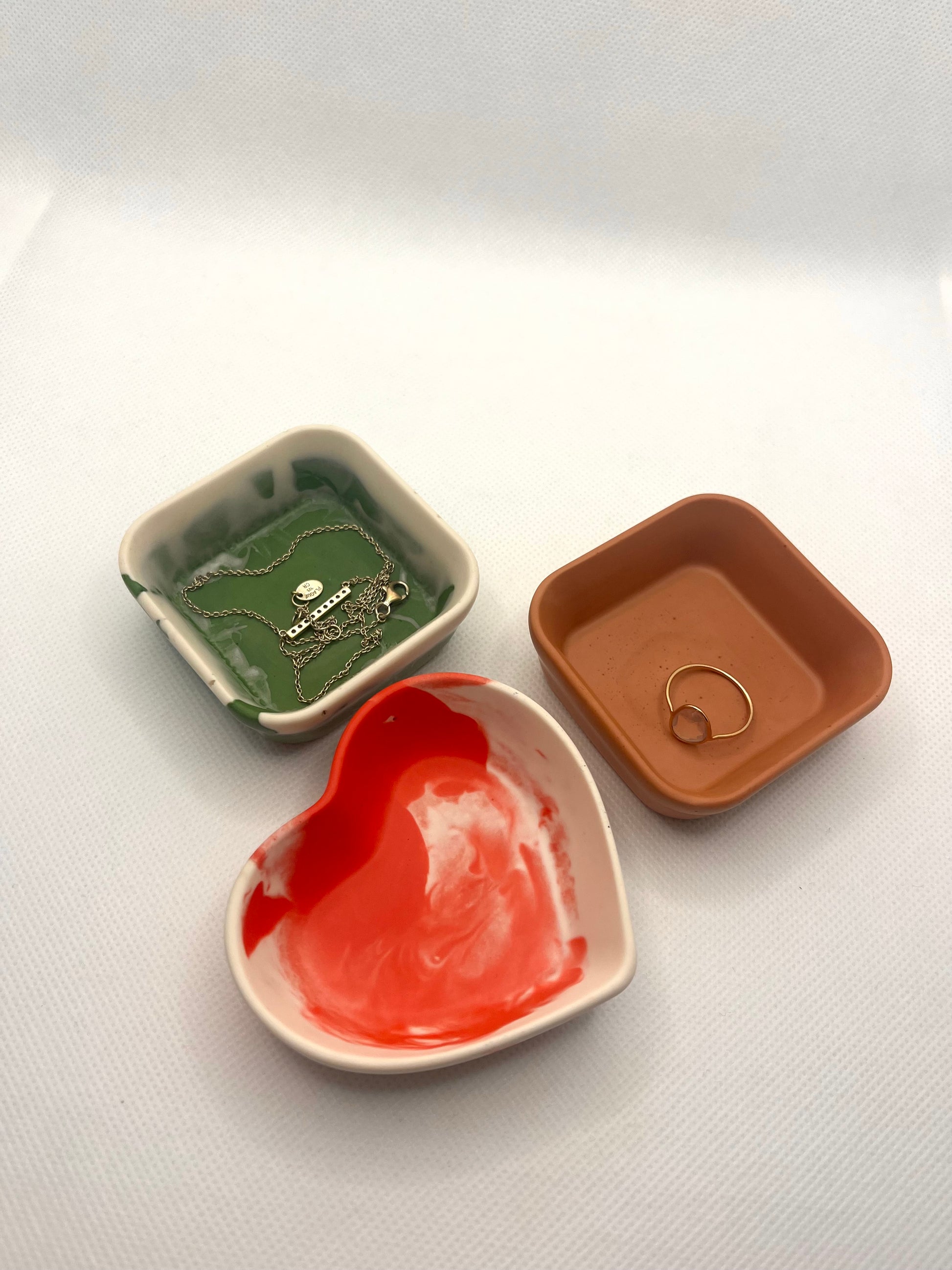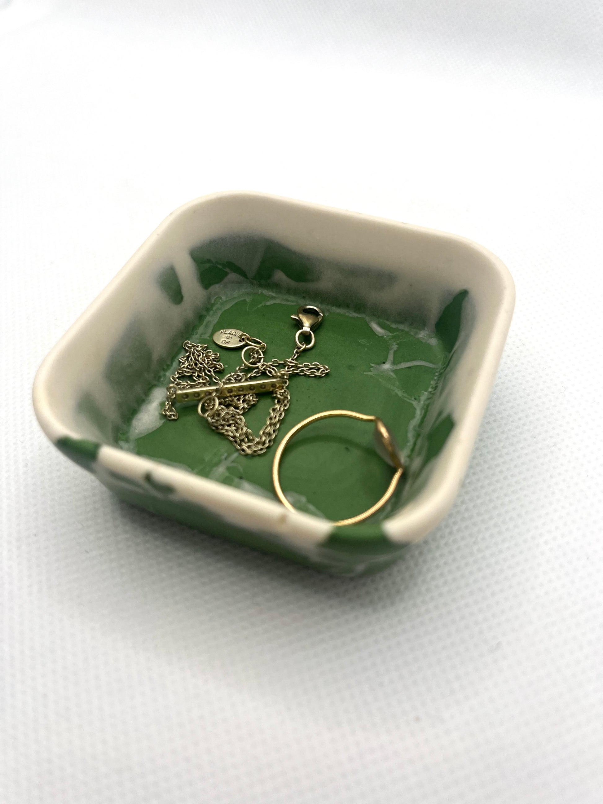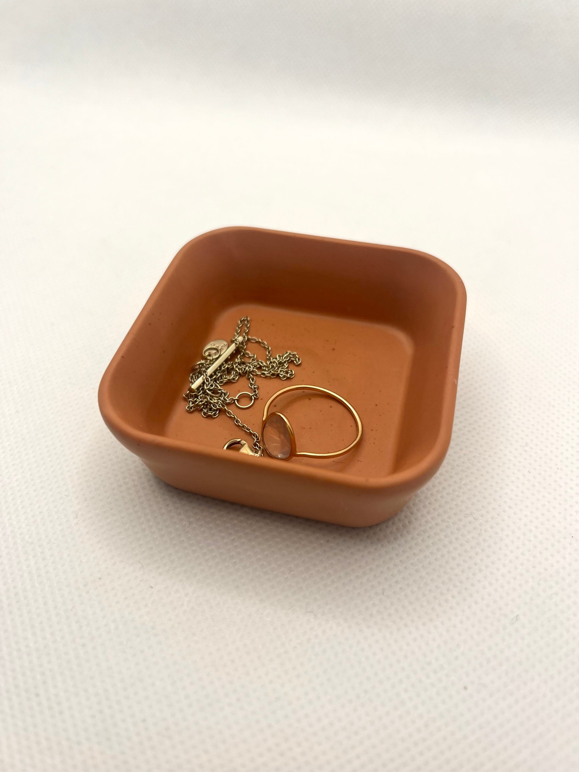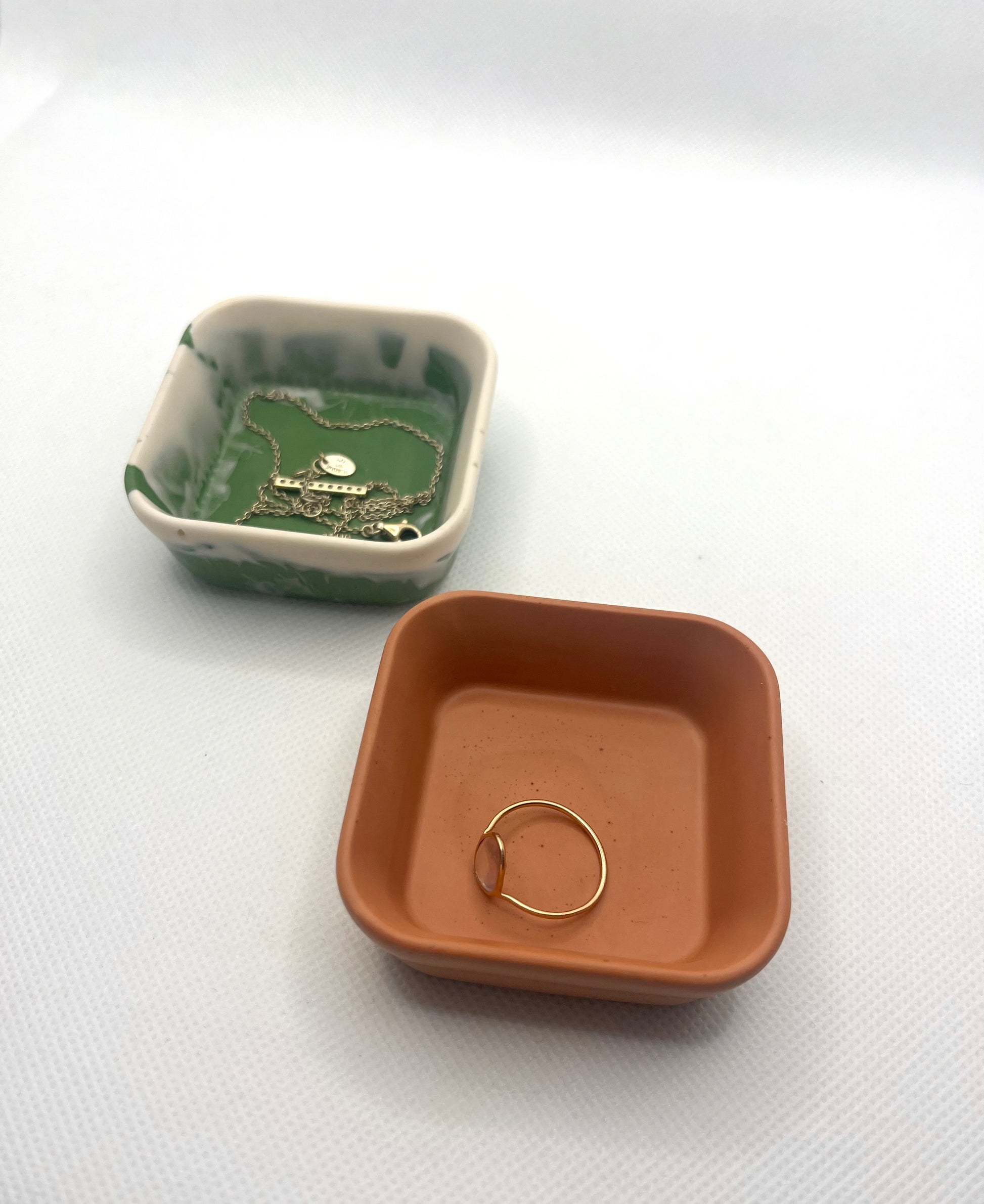 Coupelle de forme carré faite à la main à base de Jesmonite, un matériau respectueux de l’environnement.